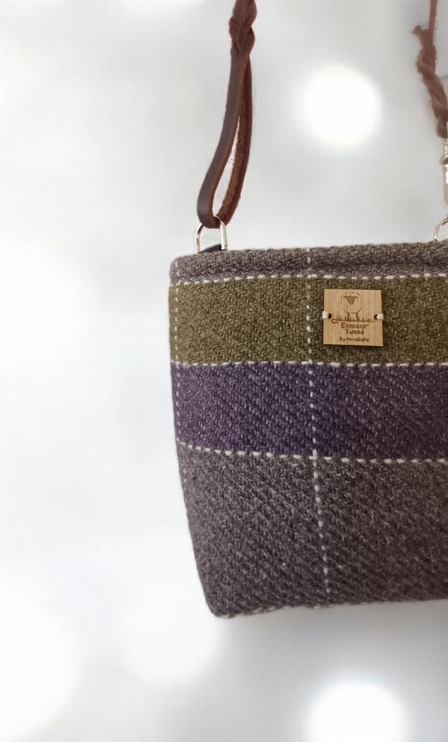 Beautiful Exmoor Tweed handbag handmade and woven by myself from 100% wool from my flock on Exmoor. the bag is cotton lined with sheep fabric and a horn fastening. Medium hand bag that I have handwoven in the Exmoor Tweed.