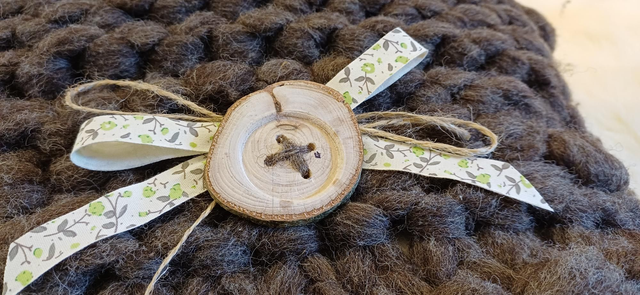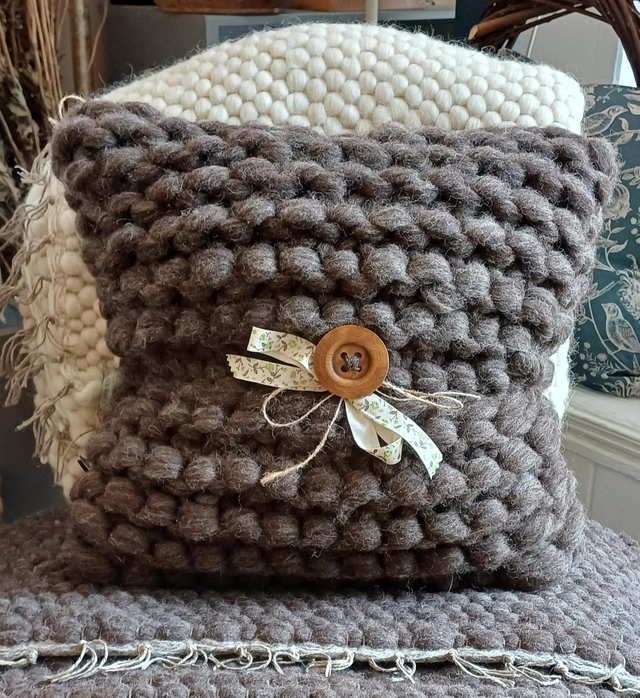 Beautiful hand knitted cushion made from 100%wool from our flock on Exmoor. Feather insert 14" x 18" 355mmx 455mm with wooden button.
