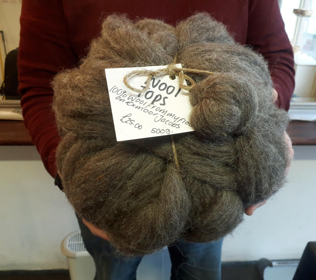 Jacob tops / rovings 100% wool from my flock on Exmoor. yarn is balled up into 500g and is one continuous length. This yarn is extremely soft, perfect for hand spinning, weaving or knitting. I personally make floor rugs and cushions felted sheep its beautiful.