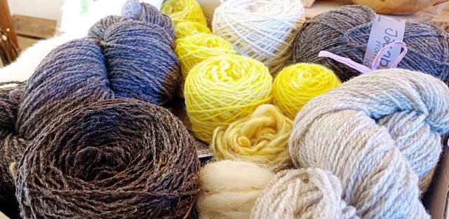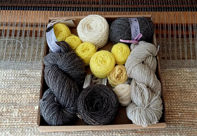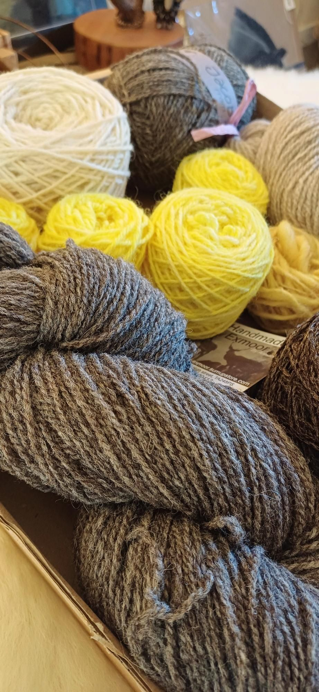A box of 100%wool from my flock on Exmoor. 100g x1 Heritage 100g x1 Jacob x devon closewool hank 100g, 100g oatmeal 4ply, 50g Jacob x closewool, 100g Jacob and a splash of beautiful yellow! All 100% wool from my flock on Exmoor. I've also added a little bit of my hand spun yarn as a little extra! Prefect for knitting, weavin & chrochet.